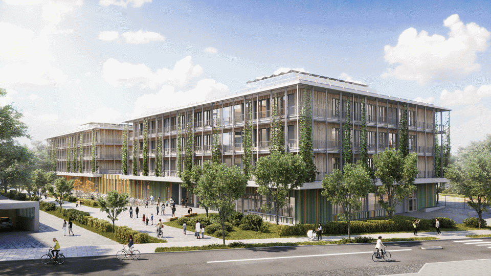 Neuer Schulcampus für den Münchner Stadtteil Forstenried - der einladende, kompakte Holzhybridbau mit Fassadenbegrünung bietet zukünftig bis zu 950 Schüler:innen ein Zuhause.